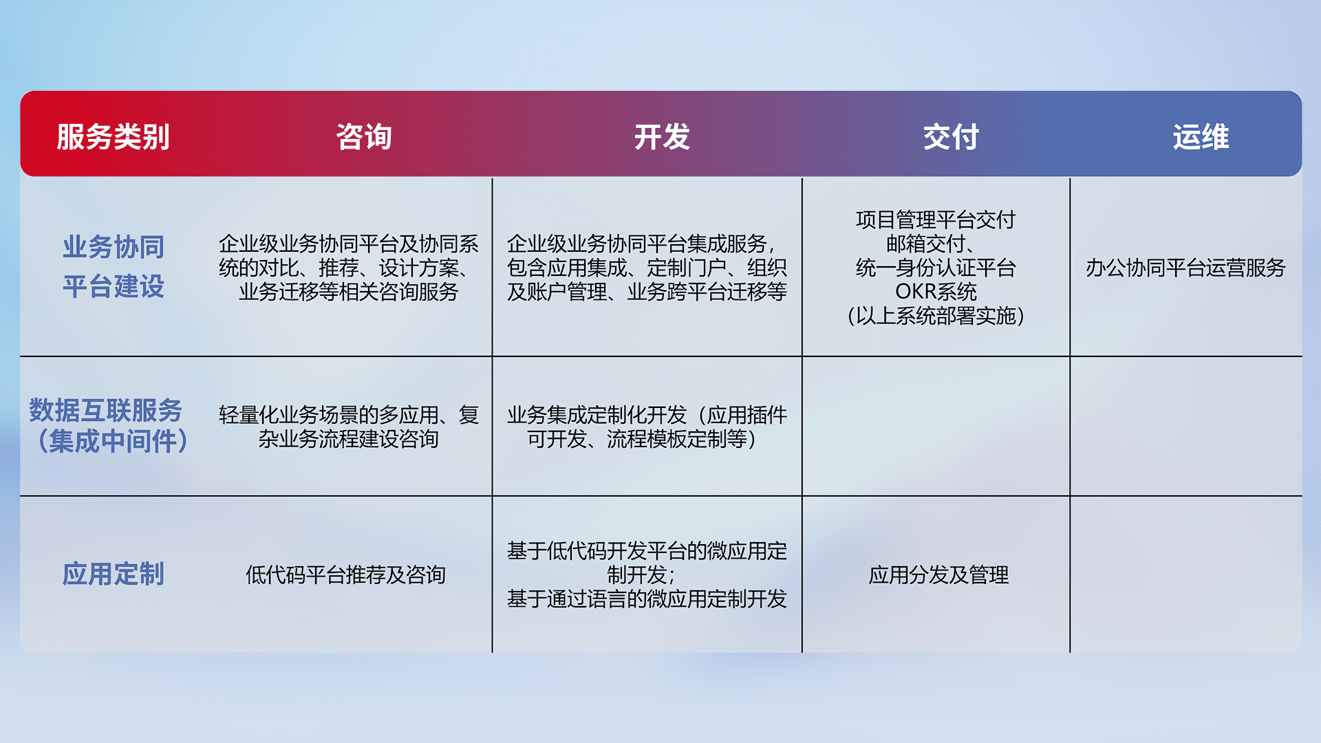 针对钉钉、、、企微、、、IDaas等平台级产品提供产品的规划、、、方案、、、、交付、、、定制化开发等服务,,实现如统一协同办公、、智能客户服务、、混合会议管理、、、智能数据查询、、等业务场景,,实现数字化转型。。